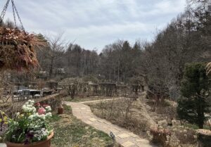 その向こうに一見まだ冬景色の庭が目に入ります